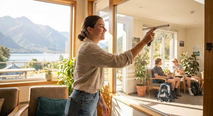 Casual housekeeper maintaining cleanliness at Nelson City TOP 10 Holiday Park accommodations and amenities.
