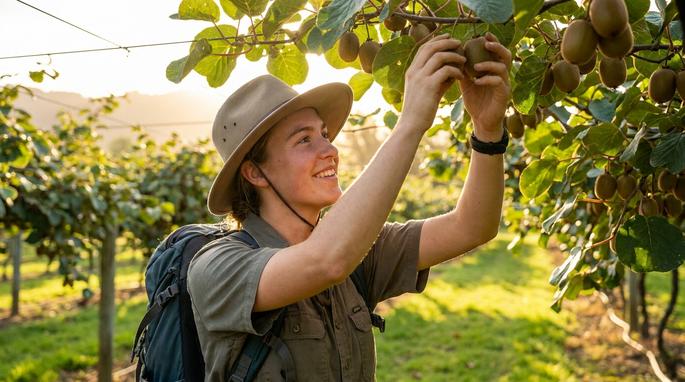 Seasonal outdoor work harvesting kiwifruit during peak harvest season.