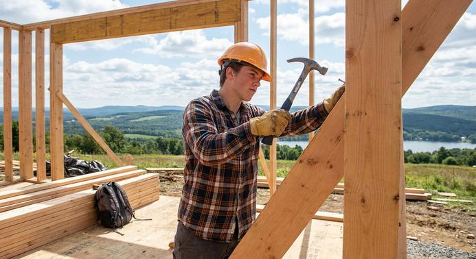 Construction worker role undertaking building and construction projects including framing, tiling, fencing, and concreting.
